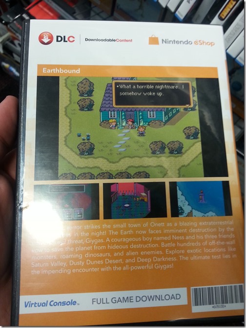 Believe it or not, certain GameStop stores appear to be stocking something relating to EarthBound. According to a report at Earthbound Central, a GameStop in Houston, Texas has been selling download cards for the Wii U Virtual Console version of the game. The GameStop in question also had empty game boxes that were re-used and fitted with information on various Virtual Console titles. The box for EarthBound can be seen below: