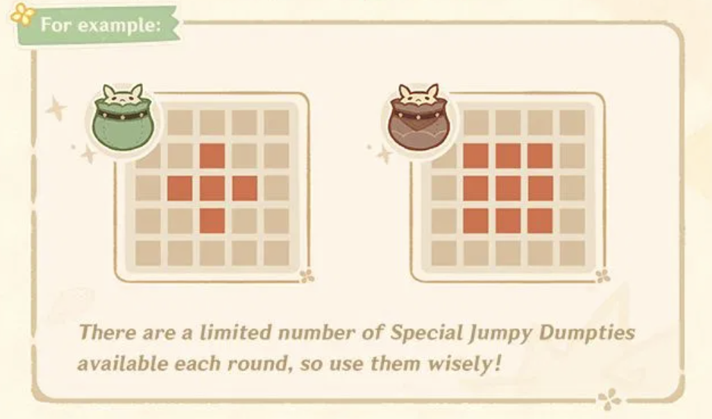 People will face a board with a Dodoco that can move along the edges. The Spikey Fish types of enemies will be arranged on the grid, as will other obstacles that will make a Jumpty Dumpty explode if it hits it. Your goal is to use the Jumpty Dumpty varieties you have to defeat all of the fish to earn points. They explode when they hit them or can be detonated after being tossed. The two example bombs shown by HoYoVerse in the image below showed one type had a range of five squares in a cross shape, while another would hit everything in a 3×3 box.