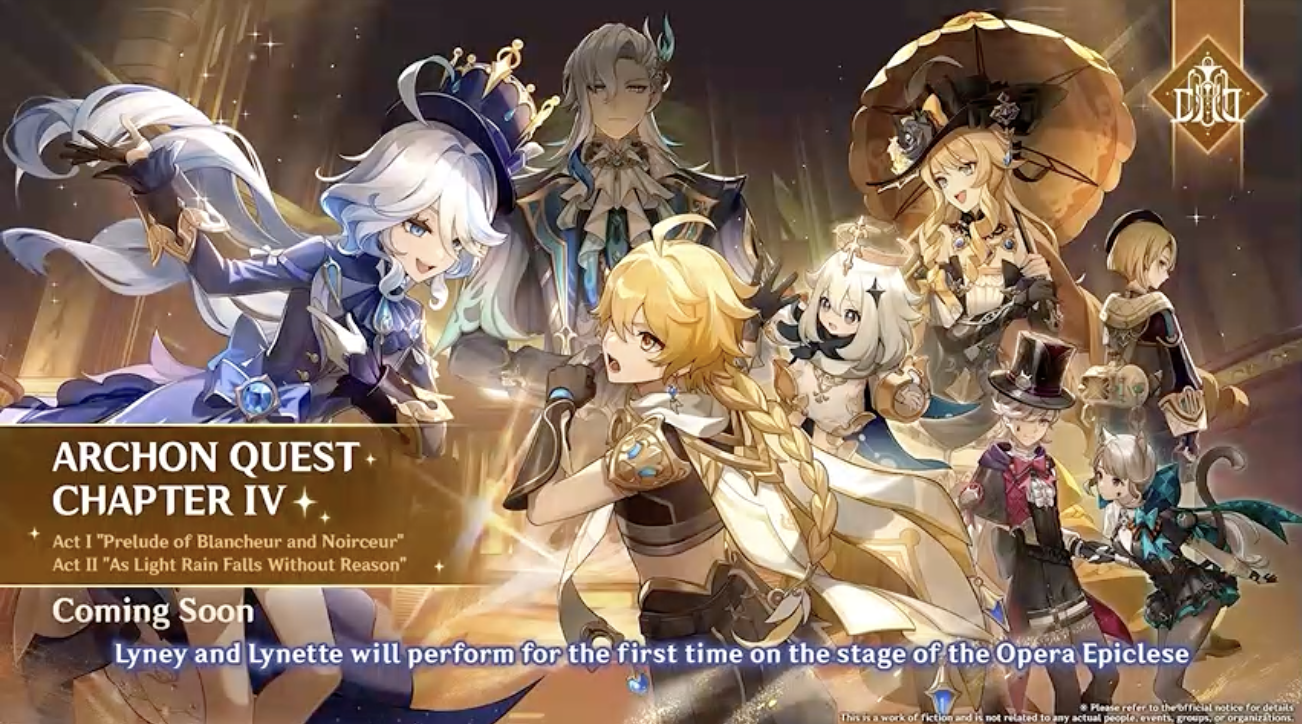 The 4.0 Genshin Impact story will see the Traveler head to Fontaine to learn about a prophecy, take part in a trial, and reunite with Childe. The start of the Special Program on on August 4, 2023 offered a brief overview of things. It also offered a chance to see more Fontaine characters from “The Final Feast” trailer. It seems a critical part of the Fontaine story in Genshin Impact will involve one of Lyney’s performances going wrong. During the first trailer, we saw him putting on one of his shows, with his sister Lynette inside of a box of water. It seems like she’s panicking, and then it shatters. There’s some commotion, as though if that was supposed to happen like that. The Traveler and Paimon are watching as that happens. It seems immediately after, they’re fighting “guardmechs” alongside Navia, who seems to be protecting the Traveler and Paimon. All this will come up in Archon Quest Chapter IV. The first parts are Act I “Prelude of Blancheur and Noirceur” and “As Light Rain Falls Without Reason.” It covers Lyney and Lynette’s eventful first performance on the Opera Epiclese trial stage.