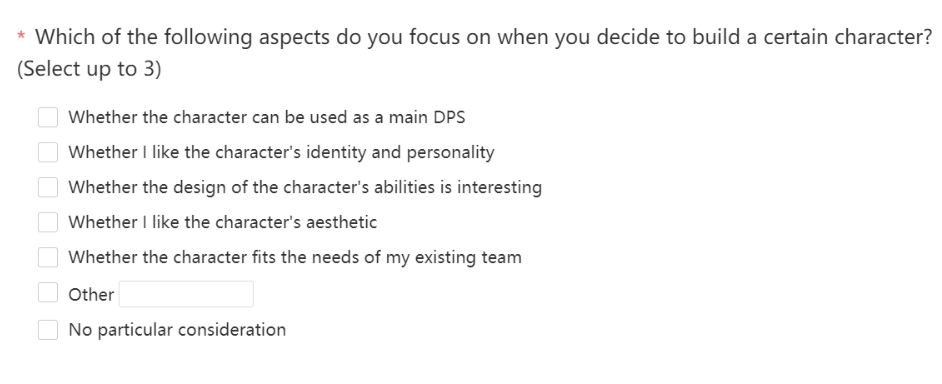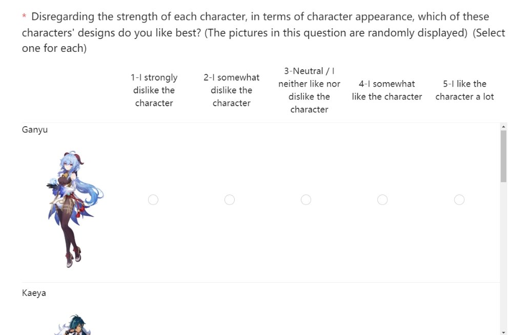 The character design survey also asks players to rate a random sampling of the game’s characters, based solely on their appearance. It then invites them to be specific, writing about their favorite elements of their faves’ designs in a text field:
