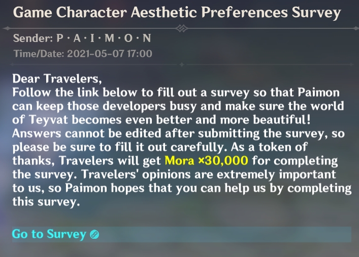 Gathering feedback is an important part of game development, and Genshin Impact developer miHoYo isn’t shy about asking players what they think. In fact, they do so on the regular, launching in-game surveys for everything from players’ opinions on recent events to thoughts on the current game balance. Now they want to know what players think about the game’s character designs through the Genshin Impact character design survey. Named the “Game Character Aesthetic Preferences Survey,” the character design survey launched with the May 7, 2021 daily reset. You can find it in-game from the Mailbox tab, via a message from Paimon: