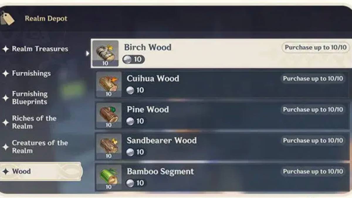 In order to be able to buy Wood in Genshin Impact, you first need to have found it. So Pine Wood is common in the Mondstadt and Liyue regions. Since it is common, it is likely you already attacked trees there to “cut” some and will see it in the Realm Depot right away. However, since an item like Yumemiru Wood is only found on Inazuma’s Narukami Island and it takes time to get there, it won’t show up until you reach that location and cut some.