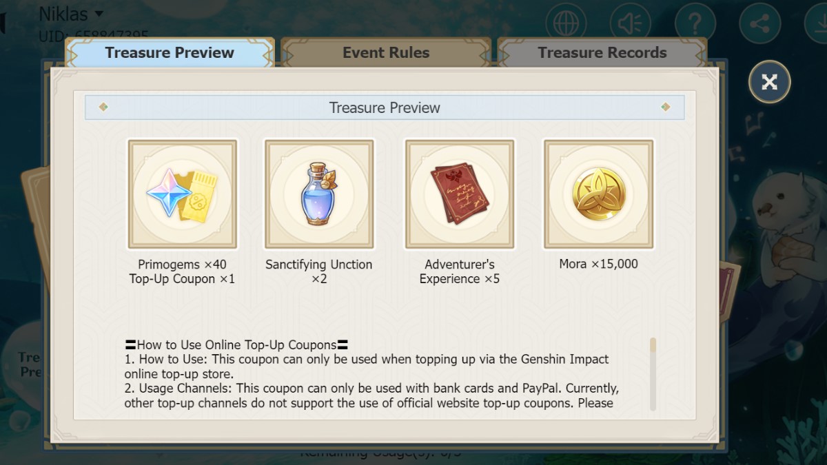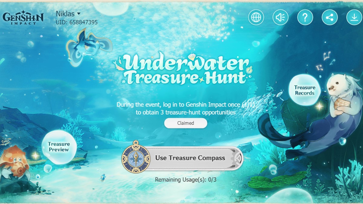 The Underwater Treasure Hunt event is pretty simple. If you log into your Genshin Impact account, you will get three chances at obtaining treasure. Each pull has a chance of pulling a new rewad. However, you can only pull three times per account (if you have playthroughs on more than one server, these do not count as separate accounts). To get your treasure, click on the Use Treasure Compass button.
