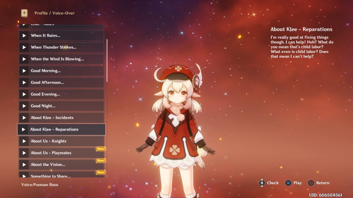 The basic voice-over recordings are, well, what you’d expect. The character will repeat things they’ll say when you’re idle in-game. For example, Zhongli’s line about Osmanthus wine is there. There’s an introductory line. You can hear them comment on the weather or time of day. These are things you’d expect from any sort of sound test. But then, you start scrolling down and start hearing Klee talk about things like reparations and child labor, and it hits you. The Genshin Impact voice lines are something special.