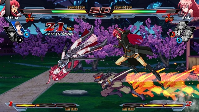 Another Nitroplus Blasterz fighter is Ethika Kibanohara. She’s one of the main heroines in Tokyo Necro, Nitroplus’ 15th anniversary project. This young woman is one of the Private Special Living Dead Stalkers who helps fight the undead and their necromancer controllers. An adept user of martial arts, she’s also known for using her Rabbit Punch, AA-24 custom shotgun, and AK-50 Kalashnikov assault rifle to take down anyone in her way. Both guns have bayonets attached to them, by the way.