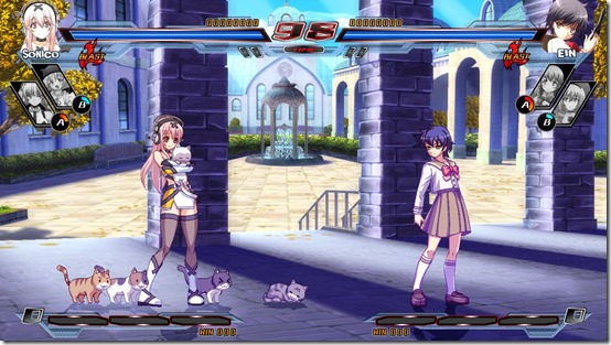 Super Sonico’s Nitroplus Blasterz attacks tap into two elements of the heroine’s life. First, she loves cats. As such, she’s followed by a group of them and has them aiding in her attacks. She’s also a singer and guitarist for First Astronomical Velocity. As seen in this match between mag-magu-jack and phantomile0110. It looks like Suzu Fujimi, the group’s lead singer and bassist, and Fuuri Watanuki, the group’s drummer, leap in at about the 23 second mark, with Suzu showing up again at 1:24 to join an attack with the cats.