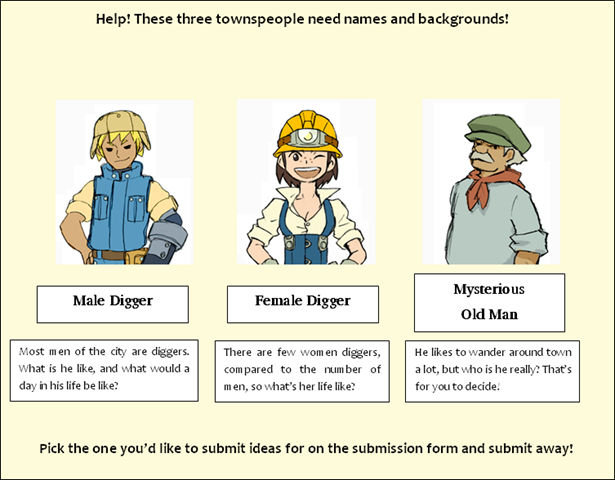 In the case of dialogue submission, the Male Digger has been replaced by a cop. Here, what you need to do is write up a memorable line for each of these characters. Submission guidelines can be found here.