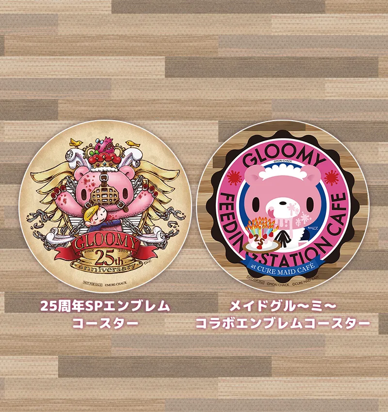 As mentioned above, consumers will be able to order unique Gloomy Bear 25th Anniversary drinks at CURE MAID CAFE. Those that order two or more menu items that are part of the collaboration will receive special coasters drawn by Gloomy Bear creator and illustrator MORI CHACK. A free random gift will also be given to those that spend more than 2,000 yen on Gloomy Bear related merchandise.