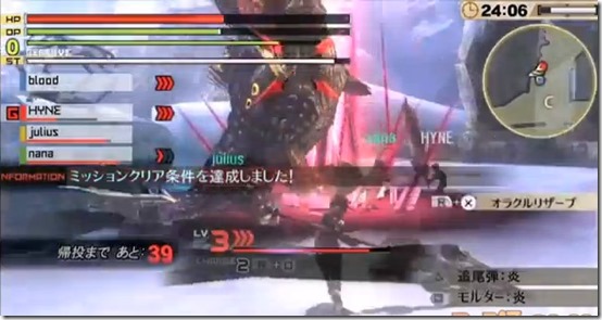Just as it looked like the monster was retreating, it returns for more, and this time for good. The group continue to hunt it down, using their best abilities. The flashy attack with the red spikes is from the Buster Blade’s “After Impact” type Blood Arts. There are over 200 Blood Arts available in the game; however, they are categorized by types, which vary according to the weapon. After defeating the Aragami and consuming it with their God Arcs, the party’s next task is to take on the familiar Aragami from Gods Eater Burst, Chi-You, who was known for giving novice players a tough time in the past. It seems to have the same moveset from before, so it shouldn’t be as tough to take it down with the help of Blood Arts.