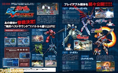 Bandai Namco revealed the latest Mobile Suits to join in on the action for their upcoming action shooter Mobile Suit Gundam: Extreme VS Force in this week’s issue of Famitsu magazine. The preview scan shows the following of God Gundam (Mobile Fighter G Gundam,) Destiny Gundam (Mobile Suit Gundam SEED Destiny,) Re-GZ (MObile Suit Gundam: Char’s Counterattack.) Mobile Suit Gundam: Extreme VS Force will release in Japan on December 23, 2015 for PlayStation Vita.