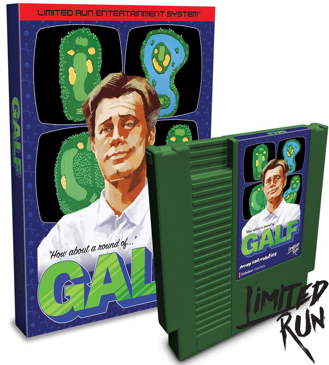 When Galf appears for sale on Limited Run Games, there will be three possible cartridge options for $44.99. There will be 1,500 sold, 450 of them golf ball white and 1,050 of them grassy green. Each one is in a retro-inspired box and comes with a dust sleeve and instruction manual. Spoony Bard Productions’ Tomas Guinan is responsible for this version’s programming, while Infinite NES Lives is making the cartridge shells.