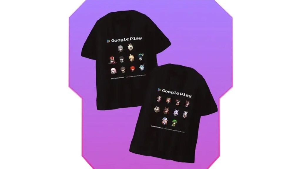 You can get two types of t-shirts by pre-registering with a Platinum or Diamond account. Both of them feature pixel art of characters underneath the logo for Google Play. One of them features Umamusume: Pretty Derby characters like Gold Ship or Special Week. The other shirt features HoYoVerse characters. Genshin Impact characters on the shirt include Venti and Diluc, while Honkai: Star Rail has characters like Stelle and Dan Heng.