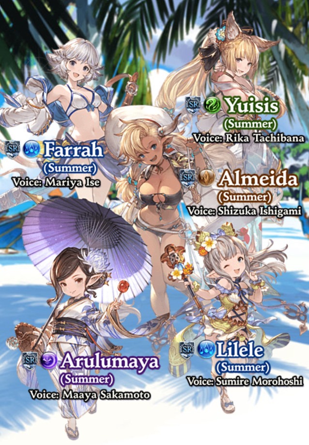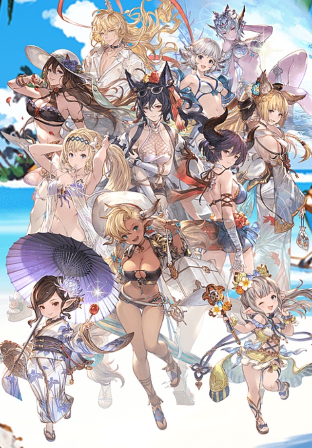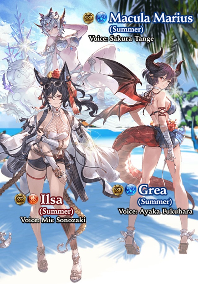 From now through September 3, a Premium Gala Draw Time will double the rates of standard SSR draw rates. However, the summer-themed character weapons and summons are only available until August 31 at 11:59am JST. Items in the Premium draw will change after 12:00pm JST on August 31. Here’s a look at some of the Summer 2018 characters: