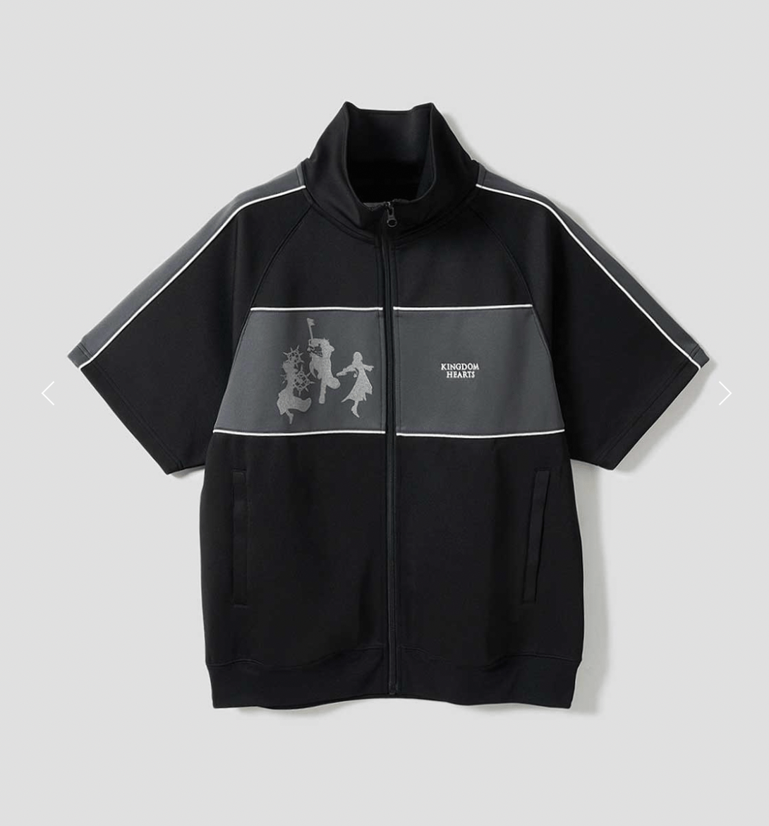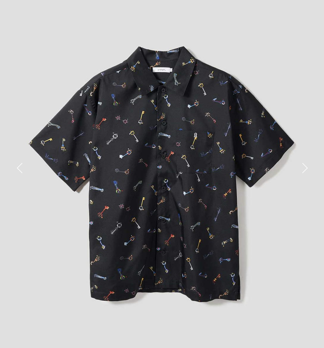 To start, there are 12 different Kingdom Hearts shirts, with eight being t-shirts. These are all unisex items, and all are available in sizes S through XL. In the cases of some t-shirts, SS and XXL are also options. Standard t-shirts cost ¥4,500/$39. The two button-up, short sleeve shirts are ¥6,900/$60 each. There is also a Timeless River Pete set that includes a t-shirt with matching shorts for ¥7,900/$68. A zip-up, short-sleeved jacket that can be worn as a shirt is also ¥6,900/$60. In addition to characters like Sora, Donald, Goofy, Pete, Kairi, Chip, and Dale, they also reference worlds from the game.