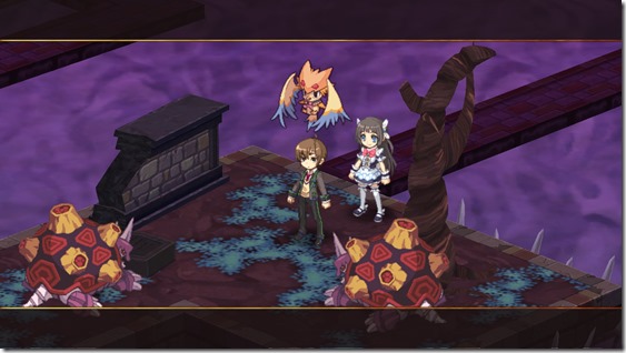 There are some measures taken to curb the monotony, but they can be hit or miss. All of the copy world dungeons have unique gimmicks for traversal; for one you will be hopping across medieval rooftops while in another you’re bending gravity in a giant cube maze. When they work they’re great ways to add variety, but some of the dungeons can become grating fast. The medieval rooftops, for example, are an interesting idea that falls apart the longer you experience it. Whenever you hop off a roof it’s a one way trip, and you need to find yourself a cannon to shoot back to the starting point. If you’re unlucky you will have to try all of the different hopping paths in order to find the correct way, resulting in having to retread a lot of old ground. And that’s only if you’re interested in finding the exit. If you want to scour the map for goodies and experience points before moving on, this process gets old fast. Perhaps the best highlights of diversity are the boss fights. Every dungeon, usually at the tenth floor, will pit you against unique monster or situation that tests your strategic mettle. These battles will usually overwhelm you if you tackle them head on, but making use of the terrain, items, and skills you have access to makes the bosses feel fun and challenging. Depending on what you’ve brought with though, these encounters can be way harder or easier than they need to be. One fight requires you to hit a book before it casts a spell that drowns you in lava. The problem is the book can teleport anywhere, and depending on the skills you have with you, reaching it in time can be impossible. If you are aware of a boss’s tactics though, then you can easily stock up on what you need and completely overwhelm it. It’s most fun to fight a boss on your own terms and make do with what you have, but that’s not always realistic. Disappointingly, the fact that the dungeon layouts are different every time does not add much to the game. A lot of the gimmicks greatly overpower the differences in level design, to the point where the same layout would be preferred for convenience sake. If you’ve hopped on one medieval rooftop, you’ve hopped on them all. Story intermissions were ultimately the best motivation for making progress. Whenever you move up a floor in a mandatory dungeon, you are treated with story scenes depicting Renya and Lilliel trying to grant their believer’s wish. The wishes as well as their wisher are almost always bizarre, and you’ll find yourself going from making Cinderella happy to helping a zombie eat people. In a sense it’s like a fun Saturday morning cartoon with a “wish of the week” format, although there is an overarching plot mixed in to keep most of these situations relevant. The Guided Fate Paradox has no shortage of charm, but warming up to it can take some perseverance. The random nature of the game makes it difficult to know what exactly to expect, as you’re always in danger of walking on an explosive panel or getting caught by an enemy who is out of your league. That’s part of the excitement and challenge, but it’s not for everyone. Be prepared to lose progress and feel bad about your decisions. Food for Thought: 1. In addition to being able to talk to your angels outside of the dungeons, you can also converse with the one you bring inside. These are completely optional, but can flesh out the characters as well as offer some back-story for the world. Hearing Lilliel’s various in-universe explanations for game mechanics can be pretty amusing. 2. The grid system made moving around initially disorienting for me. If you’re having trouble, hold square to turn without moving to be sure you’re going to go in the right direction. 3. Just in case anyone was wondering: my equipment names were Festivus Hat, Man Hand, Jr. Mint, Jimmy Leg, and Airline Peanut.