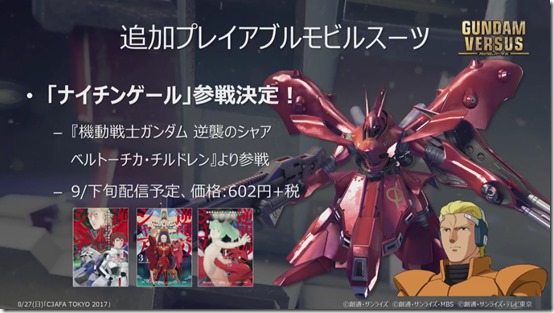 Also arriving is Nightingale as another new playable Mobile Suit unit for late-September, for the same price in Japan. Since the developers are still working on Nightingale they weren’t able to prepare a trailer to give us a look at it in action. In addition to the two playable units, Bandai Namco shared some info on the second major update, Ver. 1.05 that is scheduled to launch in Japan in late-September. It’ll add a new “1on1” mode for Player Match that allows you to make a room and go head-to-head against another player. The update also adds a new Extra Battle to the Ultimate Battle. Full details for the update will be revealed in the coming days. Gundam Versus releases in North America, Europe, and Southeast Asia on September 29, 2017 for PlayStation 4. The game is currently available in Japan.