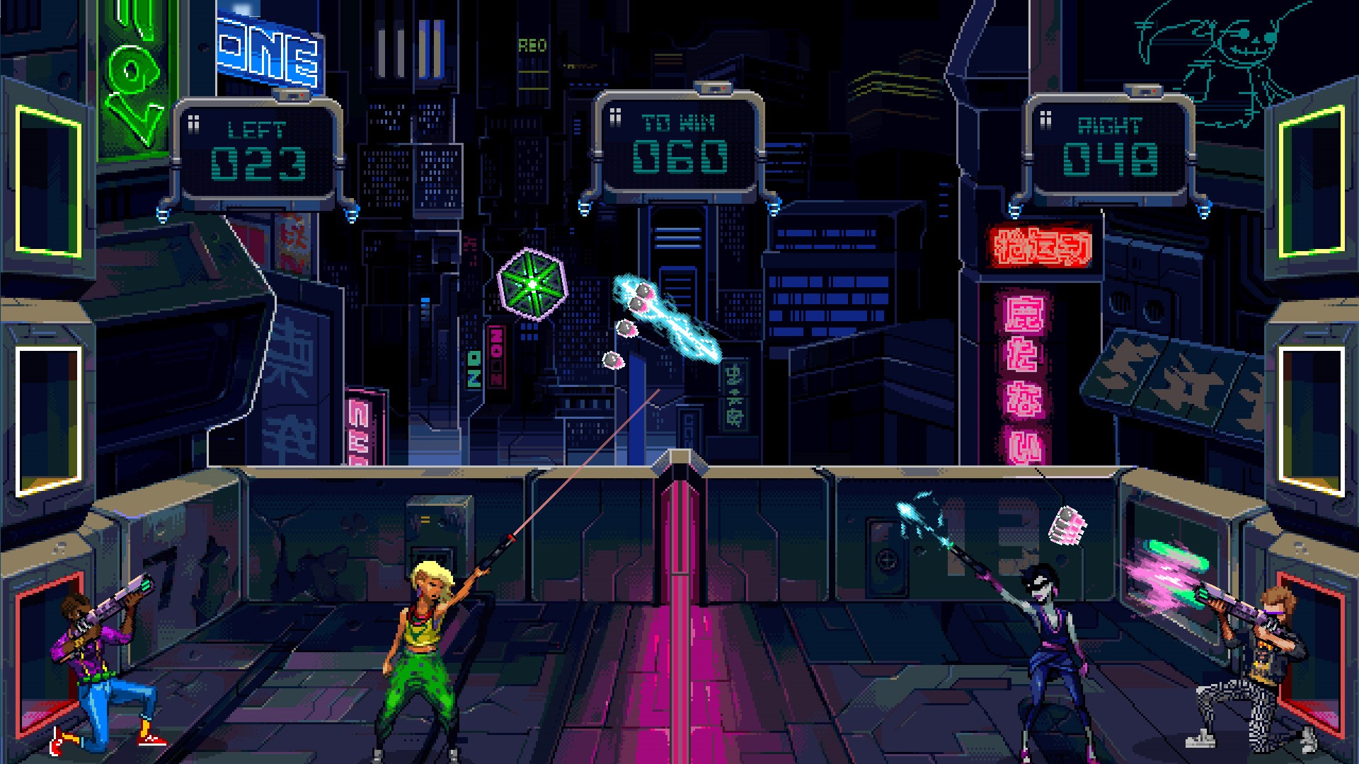 Necrosoft Games and Iron Galaxy Studios have announced new cyberpunk “online multiplayer eSport” Gunsport for PC, Xbox One, and PlayStation 4 in early 2015. They’ll be taking it to the Rooster Teeth Expo in Austin, Texas, as well as EVO in Las Vegas next year. Necrosoft teamed up with Iron Galaxy to make sure the online component is as good as it needs to be; Iron Galaxy has worked on Divekick, Street Fighter III: Third Strike Online, Marvel vs Capcom Origins, and Darkstalkers Resurrection, and so it seemed like a good fit. Played like volleyball, except… er, with guns, Gunsport is the World’s Sport in its colorful future of repurposed technology and neon lights. It’s used to settle disputes between nations after the world became exhausted by war. As such, you can expect arenas in Neo Tokyo, Neo USSR, The Free Congo, Blue Cambodia, and Nuovo São Paulo.