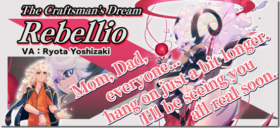 rebellio 5   Copen can earn the ‘Anchor Nexus’ EX Weapon from Rebellio: rebellio 6   Crimm (CV: Suguru Narisawa) crimm 1 An Adept in possession of the “Detonation” Septima. He fires shots of densely packed energy that explode in highly contained, yet very powerful explosions. After transforming, he shields himself with a super-tough barrier that completely protects him from any blast shockwaves. His personal creed is “Anything created by these beautiful hands is a radiant work of art!” Crimm is widely known as a charismatic beautician, but his true personality comes out every night when he goes around indiscriminately laying waste to any structures he sets his sights on. He’s not a pyromaniac…he’s a “blastomaniac.” He feels justified in this mass property destruction since he genuinely believes that there is no greater beauty in the world than acts born from his Septima. In his eyes, he is the master of fine art and the world is his canvas. He was overjoyed at becoming a Falcon, as he gained legal authority to perform his “art” whenever he sees fit.   Check out some of his attacks below: