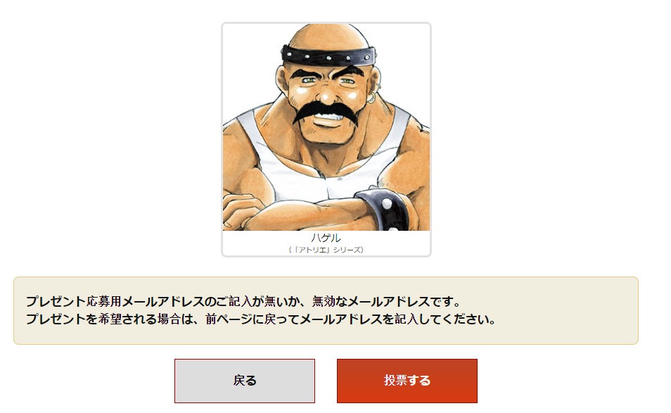 You can go here to pick your character, then hit the 確認 (Confirm) button below. There’s an email field for those who wish to enter for prizes, but it’s restricted to those living in Japan. However, anyone can vote on their character of choice without signing up with an email. Once you’ve made your selection and hit confirm, it’ll prompt you to reconfirm your vote on a second screen, which you can do by hitting the red button on the right: