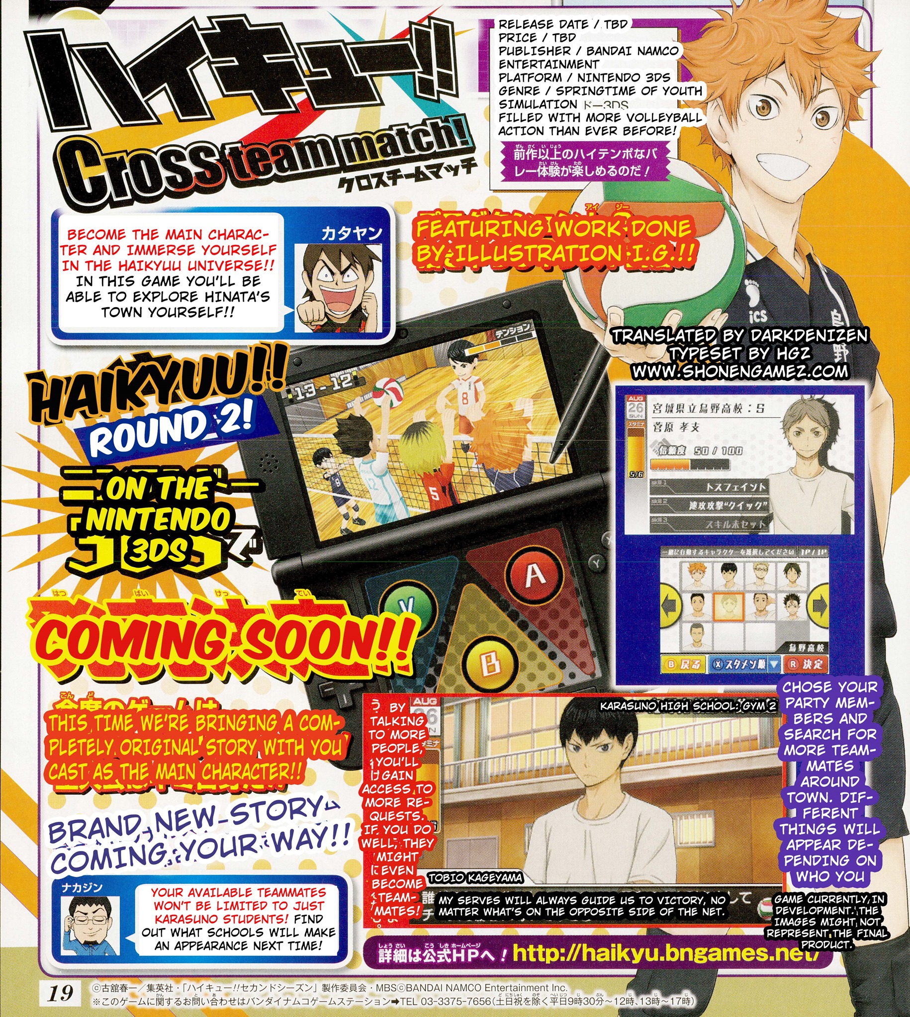 Weekly Shonen Jump’s popular volleyball manga Haikyu!! got a visual novel hybrid 3DS game last year, and the latest issue of Jump revealed that the series is getting its second 3DS game with Haikyu!! Cross Team Match. [Thanks, Shonen Gamez.] The new Haikyu!! game will let you create your own fantasy volleyball team and take on other rival schools in its brand new original story, featuring you as the main character. It’ll have RPG-like features where you’ll get to talk to various characters to gain access to more quests, and they might even join your team. You’ll also get to set your party members and search for other members to make your perfect team. Haikyu!! Cross Team Match is in development for Nintendo 3DS.