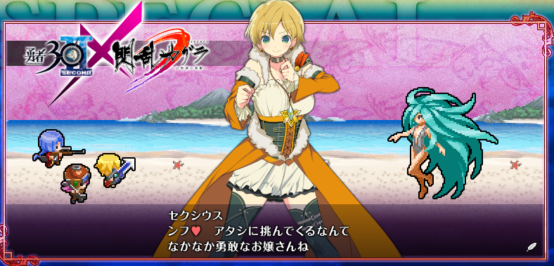The collaboration is for a flash game where Princess Yushia, one of the playable characters in Half-Minute Hero Second, fights a demon lord. You play as the demo lord and if you click fast enough you can damage Yushia’s… clothes. The game gives you thirty seconds per round. Win and you’ll get a sexy wallpaper as a reward. You can play the mini-game here.