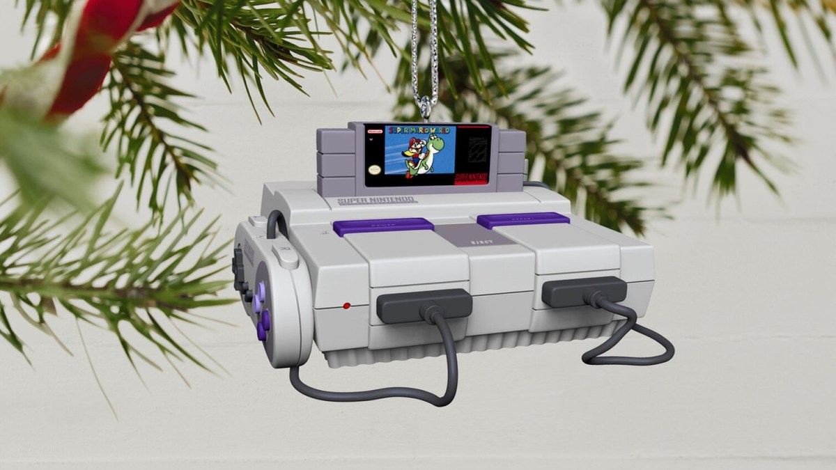 The Hallmark SNES ornament is the second in its line. In 2020, the company offered an NES ornament that would light up and play sounds. This year, starting on July 10, 2021, it will start taking orders for the $19.99 light-up SNES. It looks like it has a Super Mario World game in it and plays sounds from the game.