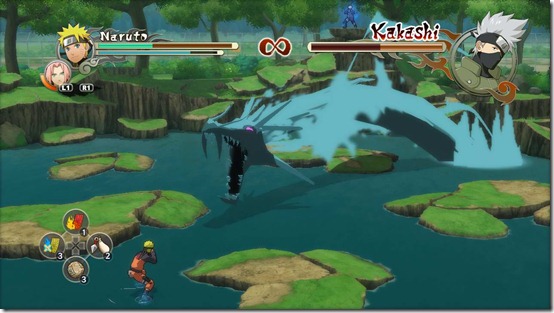 Sakura shattered the arena into pieces when she punched the ground and it remained that way for the rest of the fight. Kakashi switched gears and used a new set of moves. First, he summoned a water dragon that leaped out and chased Naruto on the battlefield. Then Kakashi jumped into the water with a fully charged Lighting Blade, which would shock Naruto if he was standing in water. I had to stand on the islands to avoid being hit.