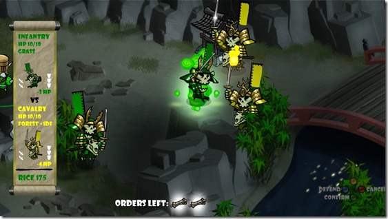 Heavily inspired by Sega’s Valkyria Chronicles series, Skulls of the Shogun places action at the forefront. Instead of limiting character movement to a grid, selecting one of your troops creates a ring around the character within which it can move freely. As your skeletal troops move across the map, certain context-sensitive actions will pop up on the overlay of the 360’s buttons. If you pass over a rice field, you can have your samurai haunt it, and the haunted field will produce 25 rice each turn. Possess a summoning shrine, and you can use that rice to summon more units onto the field. Finally, haunting a temple will allow a player to summon an animal monk.