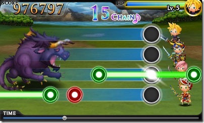 In traditional Final Fantasy fashion, the heroes waved their weapons in the air on the right and cutesy monsters appeared on the left. Characters attack when you hit notes and deal a critical hit if your timing is perfectly on beat. Miss notes and the HP meter in the top right drops a bit. I noticed Lightning who lead the group was level 21, perhaps you gain more HP as you level up? At the very least, there appears to be some kind of character growth system.