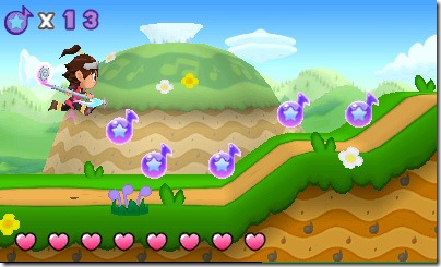 Tempo begins each stage with five hearts, and can replenish those or gain more by hitting precious eggs along the way. Tempo can carry up to eight hearts from one stage to the next as long as you don’t lose them during a stage, which means it’s sometimes helpful to go back to easier levels to gain a full eight before tackling some of the game’s trickier stages.