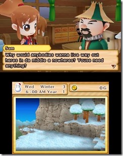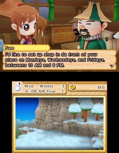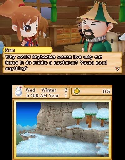 Harvest Moon: The Lost Valley has a villager by the name of Sam. He’s got a wife and daughter, so he isn’t one of the game’s bachelors, but he will be selling you goods during his frequent visits to the valley. Oh, and he talks like he’s from the Mafia. “Heh heh heh! Youse nevah woulda guessed I has a daughta, yeah?” is one of the many lines you can expect to see from him in the game. He’s described as a kind-hearted individual who also tends to be a bit of a trickster, although his family is his first priority. Sam’s wife appears to be suffering from some sort of ailment and requires a special medicine that can only be made by a character in the game that hasn’t been revealed yet. Natsume shared a couple of screenshots of Sam as well, which you can see below.