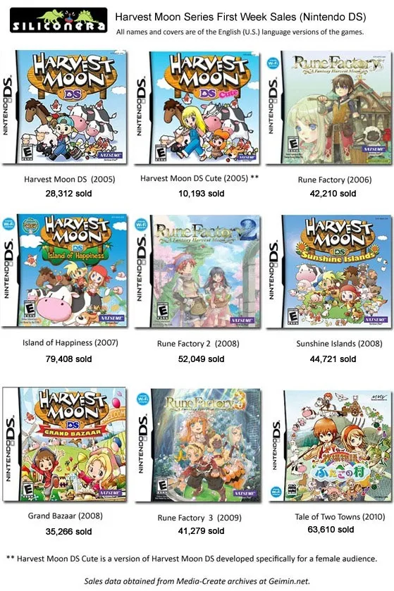 That’s higher than any of the Nintendo DS Harvest Moon titles. Here’s a look at how those fared in their first week: