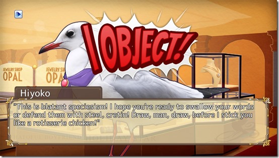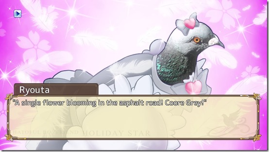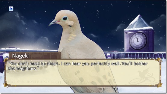 It’s a happy reminder of the contents of the original Hatoful Boyfriend. The first game was full of little Easter eggs that referenced other video games, and that Hatoful Boyfriend: Holiday Star immediately does the same is reassuring. Especially since the “Hold on!” and “I object!” effects are just similar enough to call to mind Phoenix Wright.