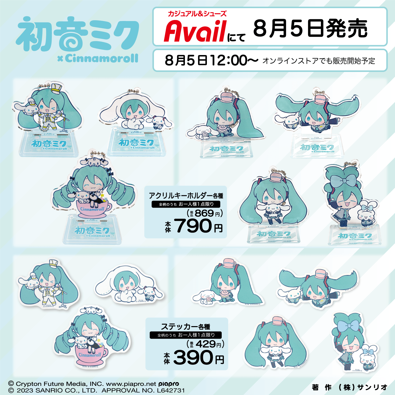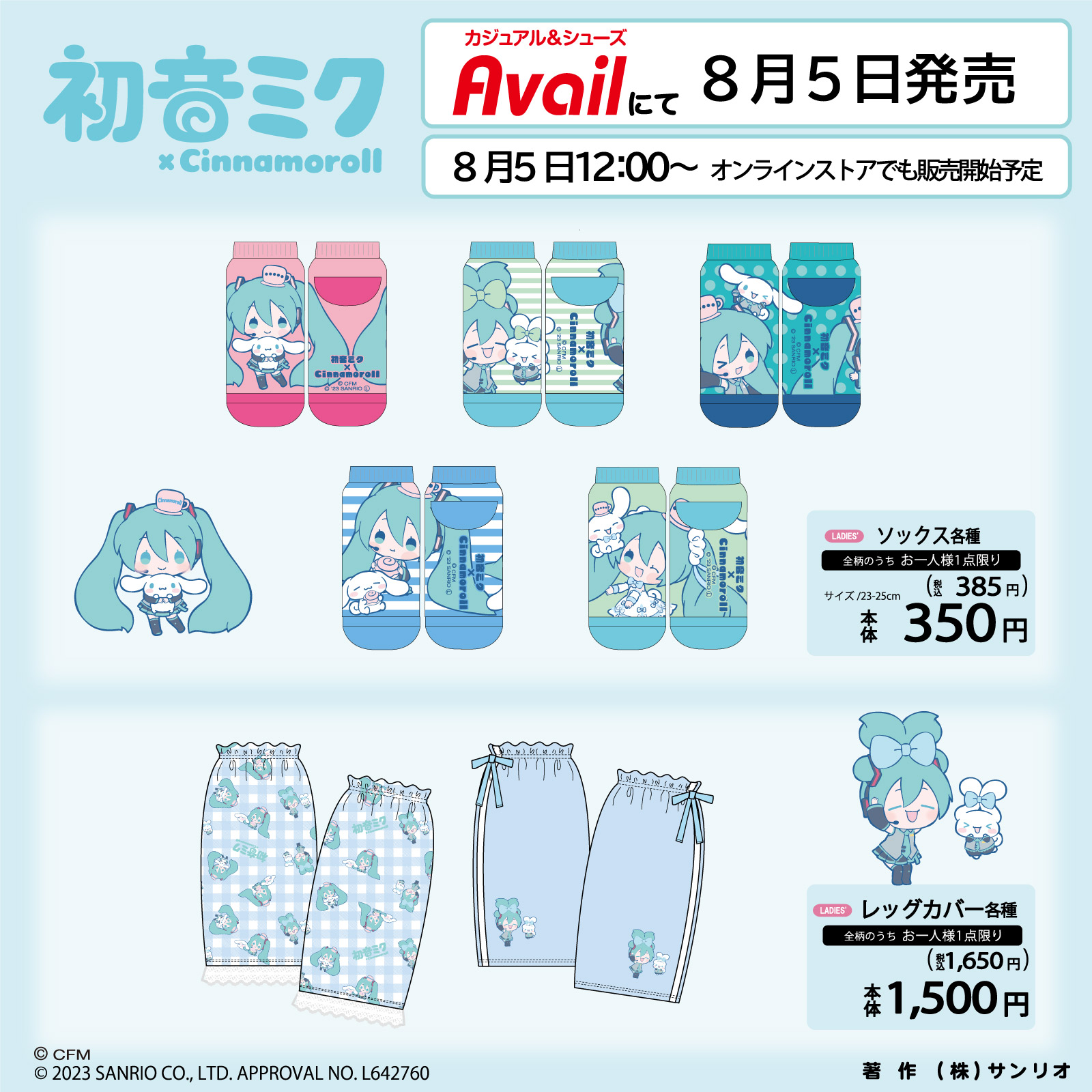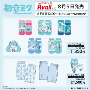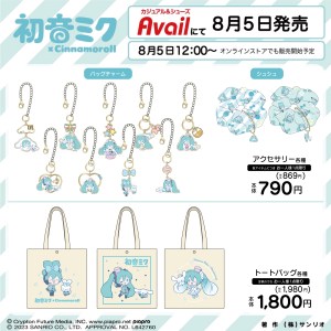 Sanrio is teaming up with Hatsune Miku to release new merchandise and apparel items of the Vocaloid character alongside popular mascot Cinnamoroll. The goods will feature both characters in newly drawn illustrations. Some of the items being released as part of the collection include acrylic keychains, tote bags, bag charms, scrunchies, socks, and leg covers. The items will be available to purchase on August 5, 2023 from select retail stores in Japan and from the Avail online store. [Thanks, Inside!] Here is a full list of the Hatsune Miku and Cinnamoroll items and their prices: