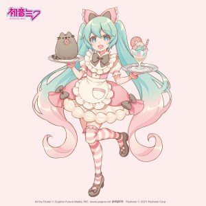 Crypton Future Media announced a collaboration project between Hatsune Miku and Pusheen. The first visual by Japanese illustrator Choke is available on the official Crypton Future Media Twitter.