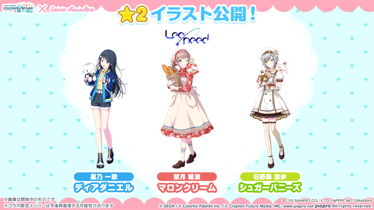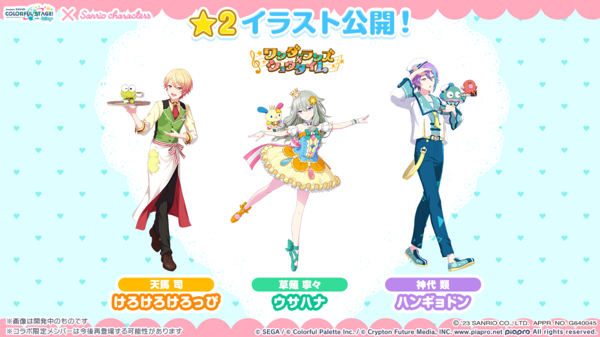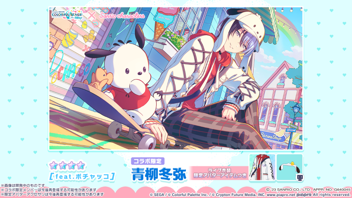 During this crossover event, players will be able to play the gacha to collect cards featuring new illustrations that will assist them during the live shows. The highest rarity cards (four stars) that will be featured include Hatsune Miku with Hello Kitty, Saki Tenma with Pompompurin, Aoi Momoi with My Melody, Toya Aoyagi with Pochacco, Emu Otori with Cinnamoroll, and Ena Shinonome with Kuromi.