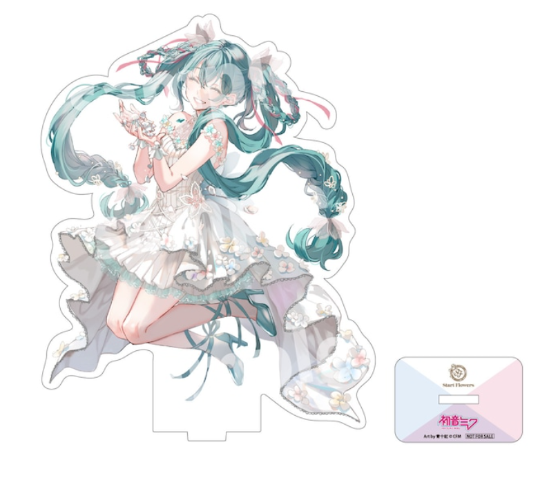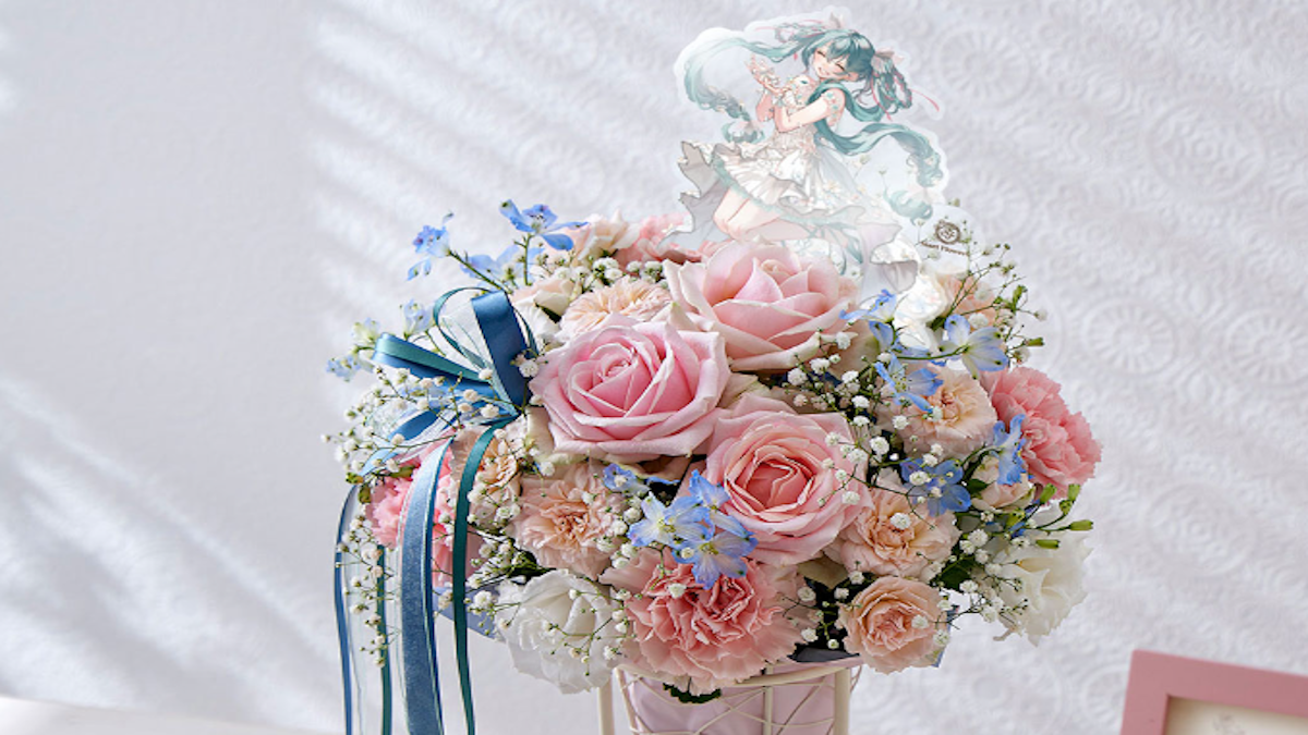 Start Flowers, a Japanese flower company that primarily does anime collaborations, revealed a new flower arrangement based on the virtual idol Hatsune Miku. The flowers are only available for purchase in Japan on the Start Flowers official site. A standing bouquet will cost 8,000 yen ($55), and a complete arrangement will cost 15,000 yen ($103). They will be sold from today until August 30, 2023. The new design of Hatsune Miku in a wispy, floral outfit was illustrated specially for this collaboration by Aoto Beni. An iron stand of the new artwork is included as a part of the arrangement. Pink, white and blue flowers are used in the arrangement in Miku’s image and reflect Beni’s new design. Its long, blue ribbons are inspired by Miku’s twin-tails. Samples of the flower arrangement were on display during Magical Mirai 2023 earlier in August. Clear files, tapestries, and towels featuring the new illustration were also sold at the venue. Get a closer look at the artwork and flower samples in the tweet below: