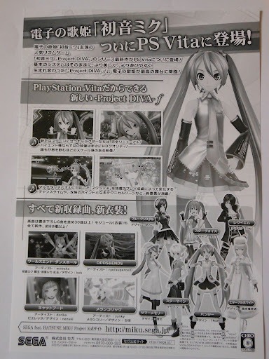 Sega have only revealed a handful of songs from Hatsune Miku Project Diva f, but the full game will include over 30 songs, all of which are new to the series, according to flyers distributed at a demo event. Furthermore, six of these songs have been created specifically for the game. The flyer also mentions over 80 modules that you can outfit the Vocaloids with. These, too, are new. Hatsune Miku Project Diva f will be released on August 30th in Japan. You can view a rundown of all the songs that have been revealed for the game so far in this post.