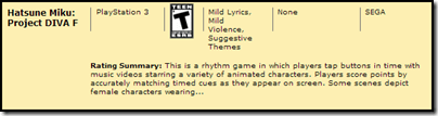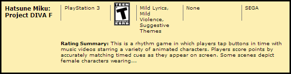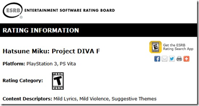 …and the updated rating that only says Hatsune Miku: Project Diva F is for PlayStation 3.
