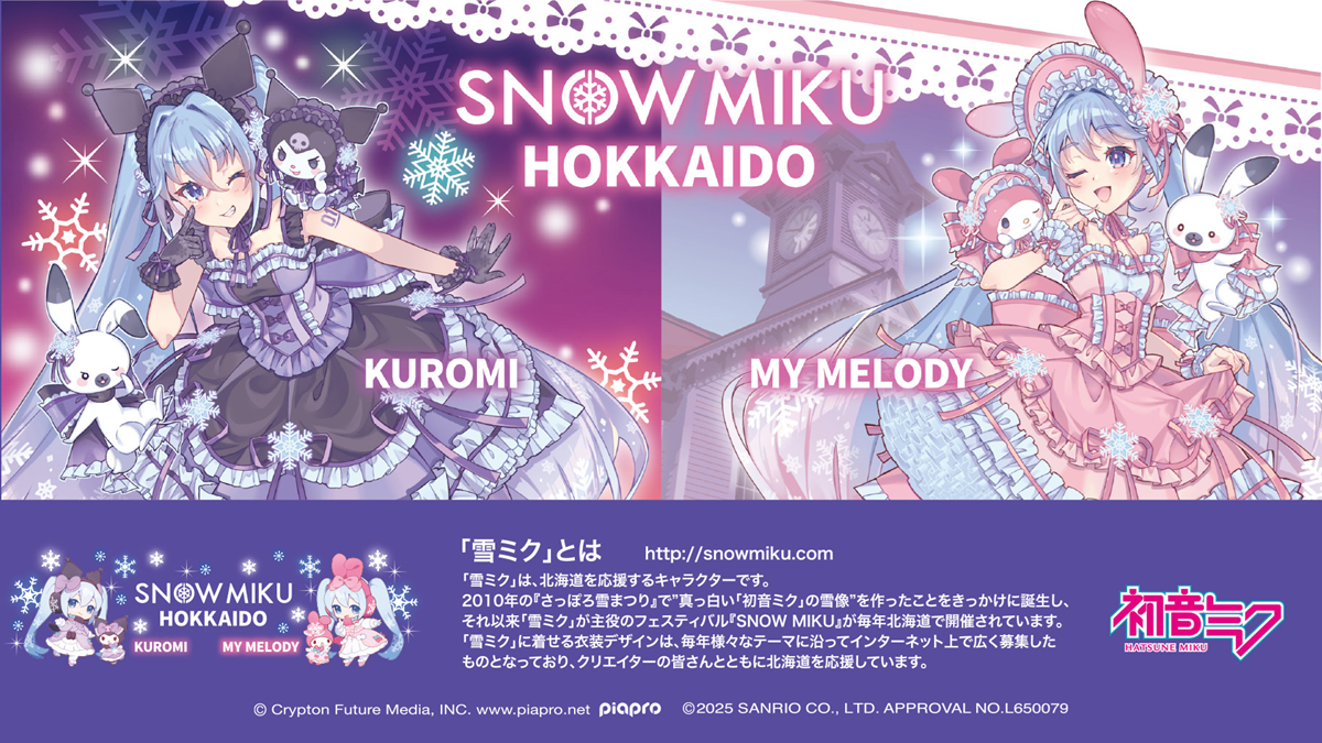 Sanrio announced the release of new line of merchandise featuring Hatsune Miku dressed as characters My Melody and Kuromi to celebrate Snow Miku 2025. The goods are now available for purchase and are being sold exclusively in Hokkaido, Japan.