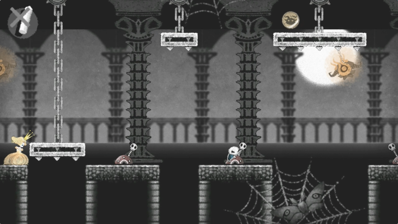 Dokuro begins with a Princess trapped in a tower. You, a lowly skeleton guard, has a change of heart and frees her. While the Princess can walk out of her cell, she needs your help to navigate through traps so she can escape. Being an action puzzle game, players have to clear a path for the Princess by defeating other monsters, pulling switches to create platforms, and using magic chalk to create water or string.