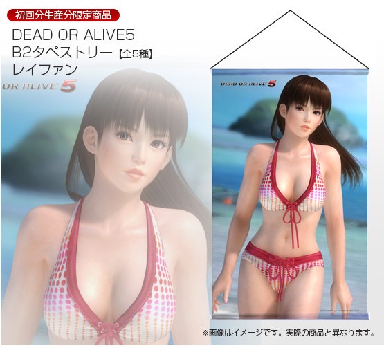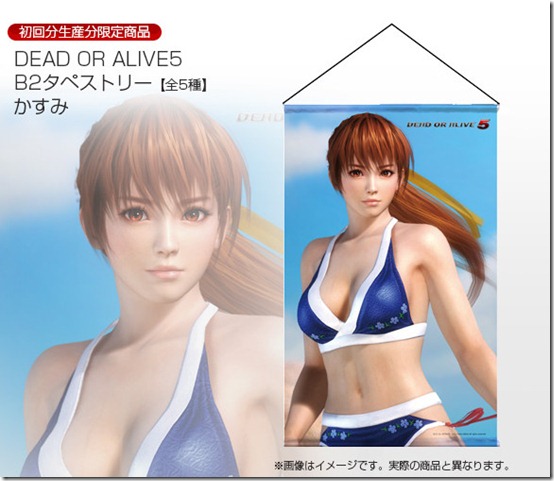Enjoying Dead or Alive 5 Ultimate? Then, perhaps you’re wondering what to get as a present for your buddy who really, really loves Hitomi. (Of course it wouldn’t be for you… of course not.) Why not check out the sun-drenched, beach swimsuit goodness of the Dead or Alive girls in this limited production run set? GameCity is selling B2 wall scrolls of the girls all ready to head for the water and sun – You can choose between Kasumi, Ayane, Hitomi, Kokoro (who wins best swimsuit in my books) or Lei Fang.