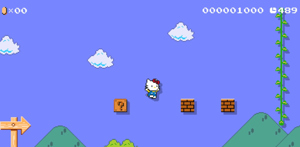 “Sanrio characters Kitty and Melody find themselves in the world of Super Mario! At first it seems like a fun place, with cute blocks shaped like apples and flowers. But they’d better be careful, because there’s danger up ahead! Won’t you help them find their way safely to the goal?”
