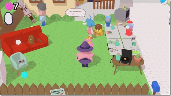 Yard Tale sets the player free at their yard sale, tasking them with matching up customers with the proper items in order to make a good sale. Doing this will net the witch candy, which is good in and of itself, but candy can also be traded with another odd creature in the garage for some unlockable clothing items so player’s can customize their sales-witch.