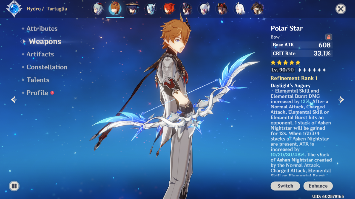 This is a good weapon for Tartaglia due to its boost to his Normal Attack. Since most of Tartaglia’s damage will come from his Normal Attack (boosted with his Skill, of course), Rust is a great weapon for him if you don’t have any of the more premium options. - The Stringless