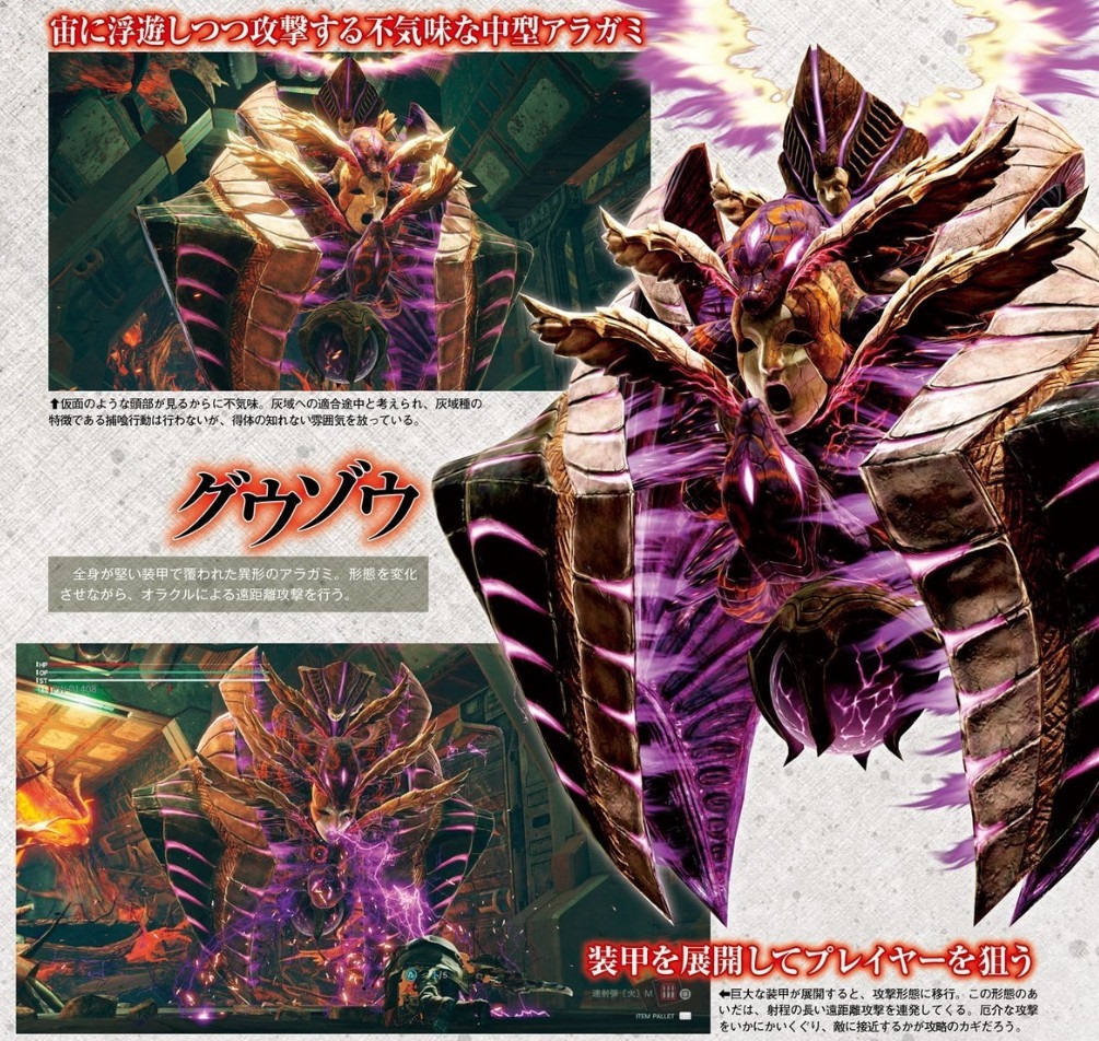 Guuzou is a brand-new Aragami who uses its tough exterior to attack enemies. It has two forms, with the one you see in the above scan capable of attacking from long range.