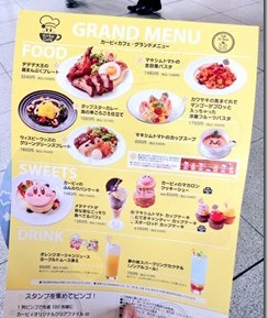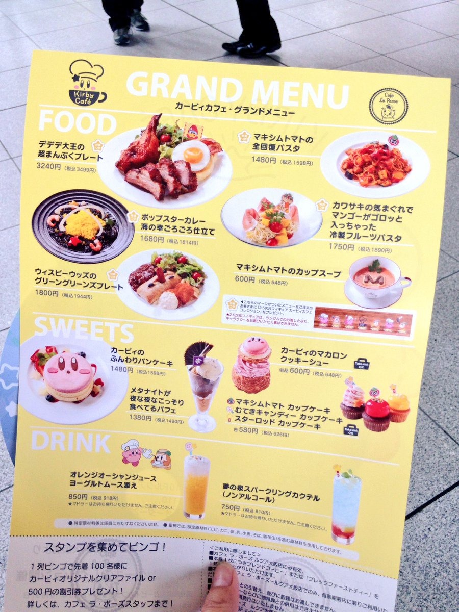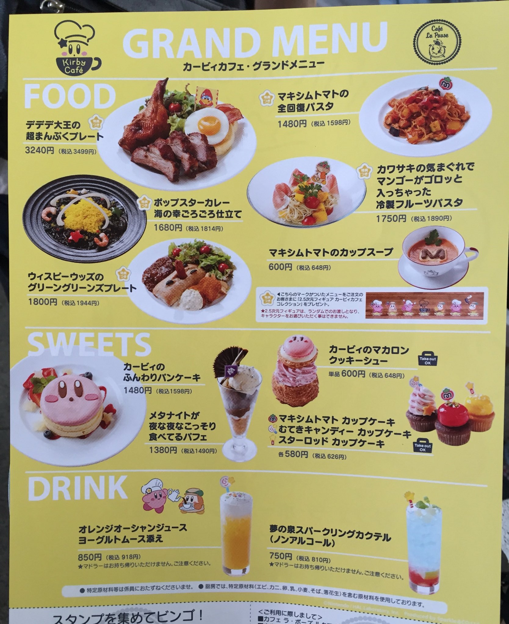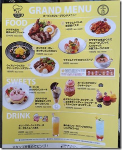 The menu features a nice selection of various entrees, desserts and drinks, all themed after characters and items in the Kirby universe.