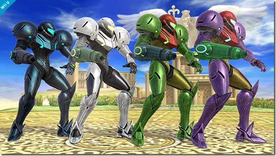 Every character in Super Smash Bros. will have eight colour variations, director Masahiro Sakurai said over Miiverse last night. Sakurai used Samus to demonstrate the feature, showing off eight different colour schemes for her Varia Suit. “Until now, you were only able to choose from four, or sometimes five or six colors for each character,” Sakurai wrote. “This time, though, all characters have eight colors to choose from! The first four color schemes for Samus are based off her Varia Suit, Fusion Suit, Gravity Suit from Super Metroid, and the Dark Suit.”