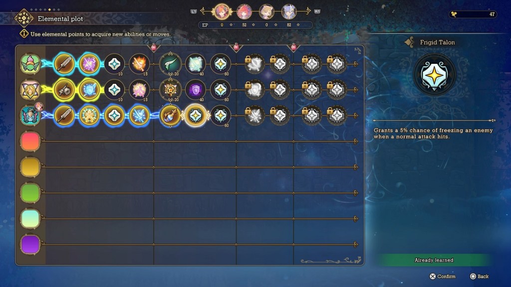 Upgrading these classes is handled through the Elemental Plot, a progression system where players can spend Elemental Points to unlock various upgrades. These upgrades include both passive skills and active abilities or attacks. Passive skills are only active when a character is in the corresponding class. However, unlocked abilities and moves often carry over to other classes. However, some moves are tied to specific weapons, meaning they can only be used by classes that wield those weapons.
