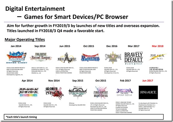 Square Enix aims for further grown in FY2019/3 by launches of new titles and overseas expansion. Titles launched in FY2018/3 Q4 made a favorable start. Amusement (Arcades)